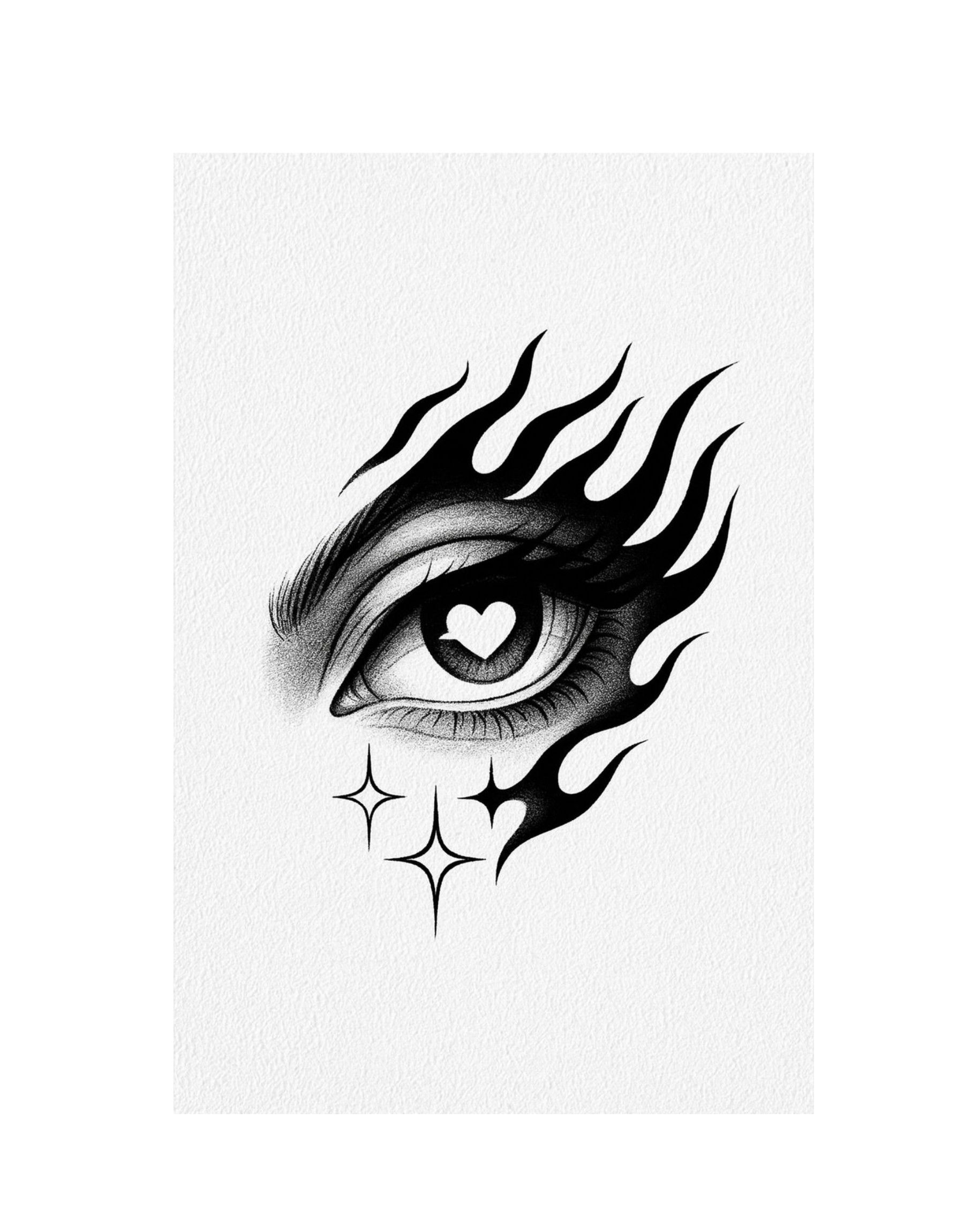 This bold flame eye tattoo blends emotion, fire, and artistic shading for a powerful look. The heart-shaped pupil and glowing flames represent passion, strength, and inner fire. Perfect for those who love expressive, aesthetic and symbolic tattoo designs.